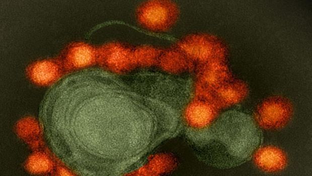 Transmission electron microscope image of Zika virus (red), isolated from a microcephaly case in Brazil. The virus is associated with cellular membranes in the center.
